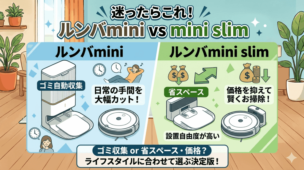 「ルンバが欲しいけど、価格が高くてなかなか手が出ない…」 そんな方に注目されているのが、コンパクトで手頃な価格帯の「ルンバminiシリーズ」です。 中でも「ルンバmini」と「ルンバmini slim」は、どちらも従来モデルより小型で導入しやすく、初めての... -