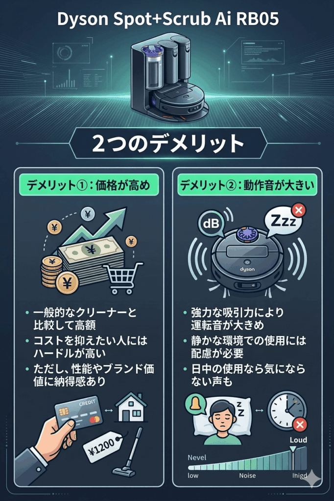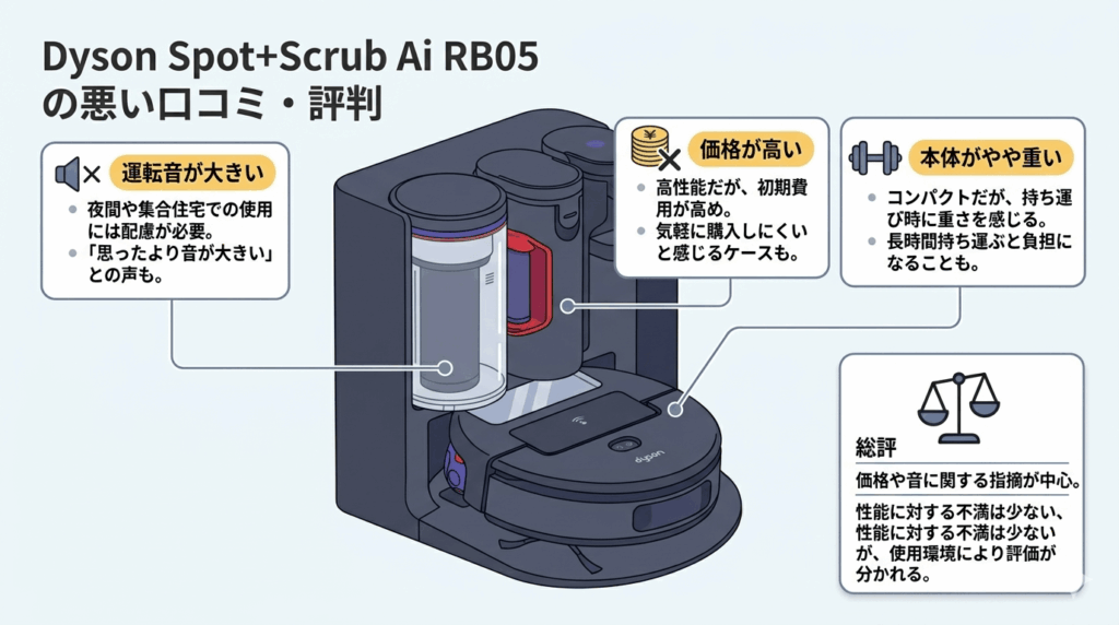 Dyson Spot+Scrub Ai RB05は高性能なクリーナーですが、価格や音、重量に関しては人によって気になるポイントになる場合があります。